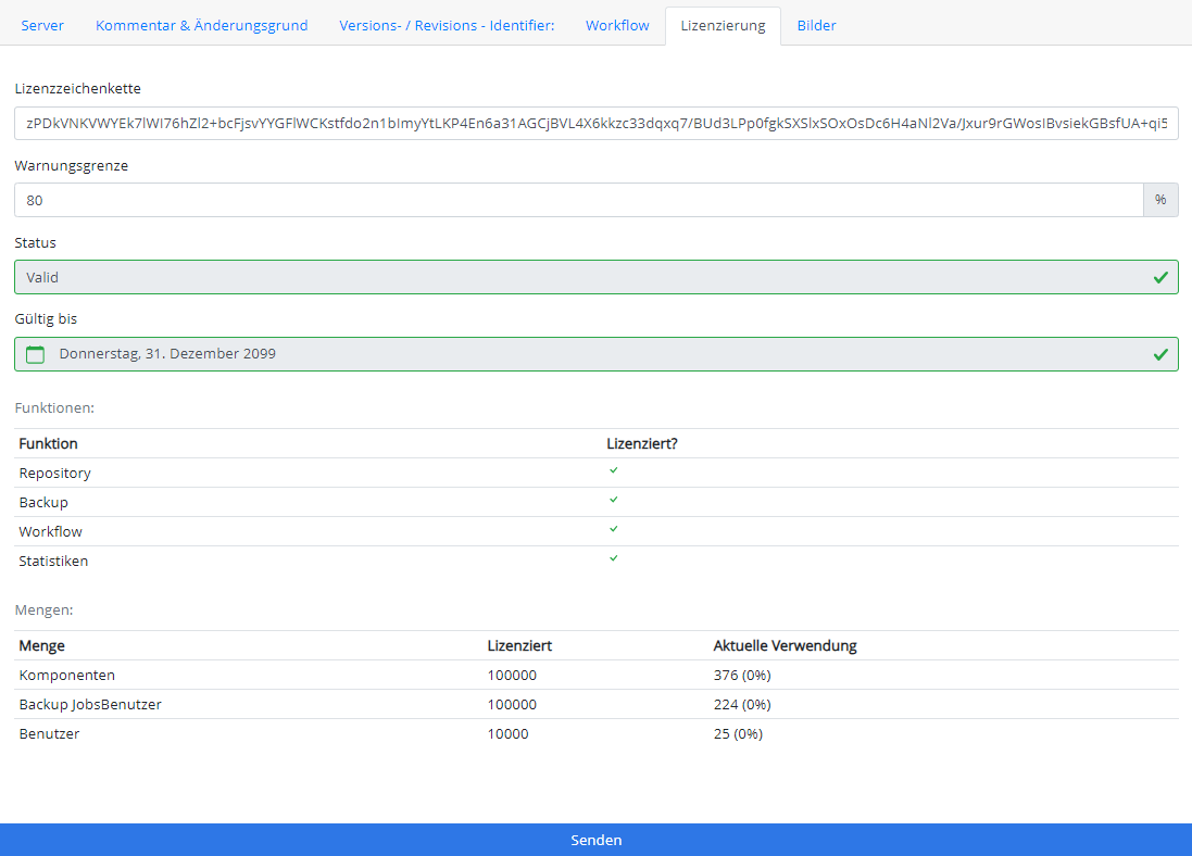 Jedes Modul kann entweder als eigenständiges Modul betrieben oder in Kombination mit anderen Modulen genutzt werden. Der Lizenzpreis errechnet sich je nach Kombination der Module sowie der gewählten Anzahl an Usern, Komponenten und Backups. Standardmäßig sind im Backup- und Image-Modul 50 Backup-Jobs enthalten, und im Versionierungsmodul sind 10 User, 250 Komponenten, alle Komponententypen und eine unbegrenzte Erweiterbarkeit enthalten.